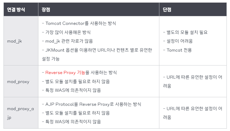 아파치와 톰캣이 통신할 때는 AJP나 HTTP/HTTPS통신을 사용한다. AJP는 아파치가 외부 서비스(톰캣 등) 과 연동하기위해 정한 규약(프로토콜)이다. 그리고 이를 구현한 모듈이 mod_jk이다. 과거에는 mod_jk를 이용한 통신을 주로 사용했지만, 최근에는 HTTP/HTTPS통신으로 Reverse Proxy기능을 구현한 mod_proxy를 많이 이용한다고 한다. mod_jk에 비해 설정이 간편하고, AJP같은 특정 WAS의존적인 프로토콜을 사용하지 않으므로 성능이 더 좋기 때문이다. 그 외에도 AJP프로토콜을 Reverse proxy로 사용하는 mode_proxy_ajp가 있다.