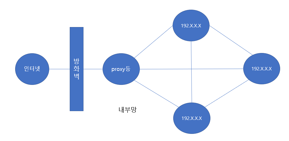 예를 들어서 회사 내부망이라고 하면, 같은 대역을 쓰는 통신망이다. 내부망 바깥에는 방화벽으로 막혀있고 외부로는 인터넷이 있다.
