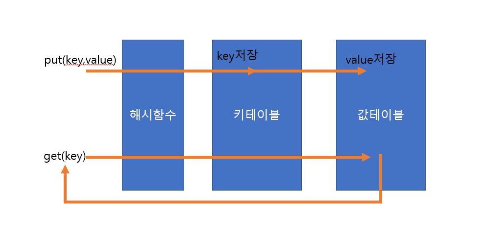 key를 이용해 해시함수를 실행하고 해시함수가 리턴하는 위치에 키와 값을 저장한다.