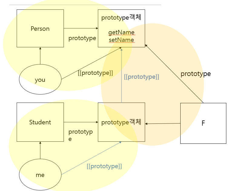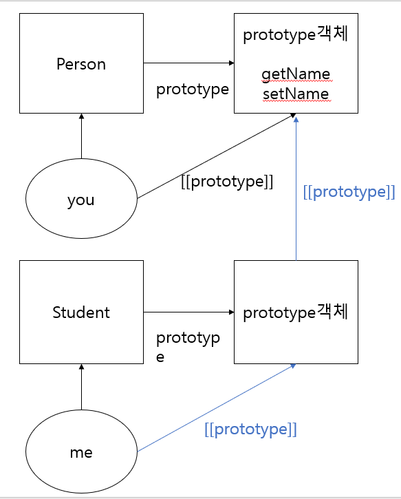 me -> Student의 Prototype -> Person의 Prototype 이런식으로 프로토타입 체이닝이 일어나면 될 것이다.