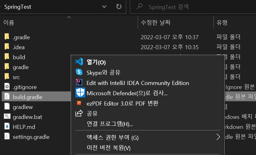 다음과 같이 build.gradle 이 있다. 오른쪽 마우스를 눌러 IntelliJ로 연다.
