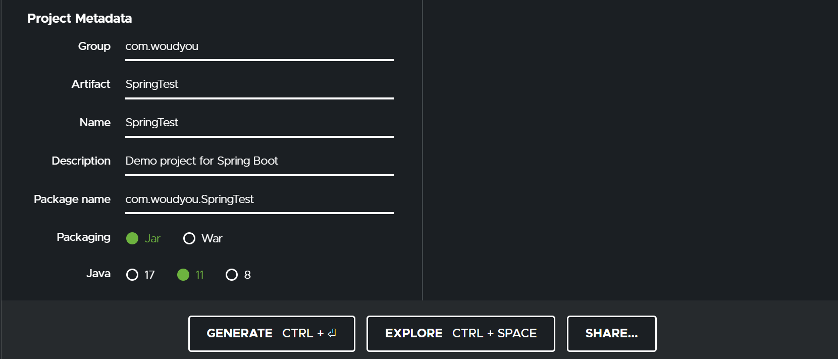 Group은 보통 회사이름 거꾸로, Artifact는 프로젝트명을 뜻한다.