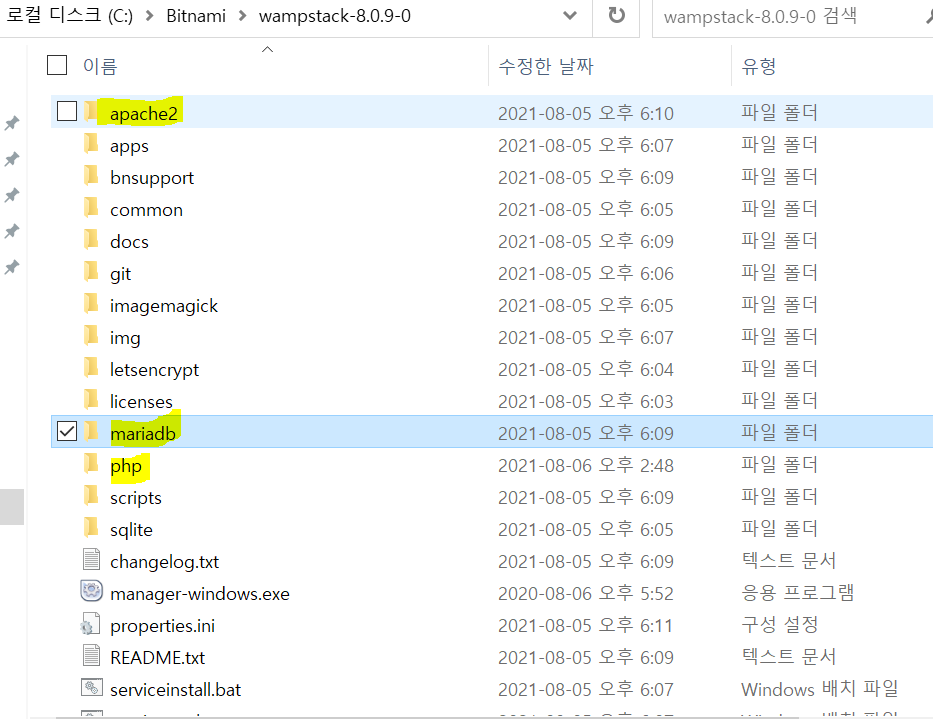 WAMP을 설치하면 apache, php, mariadb를 다운로드해준다